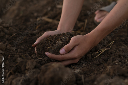 Full soil in a hand of farmer at farm. agriculture, gardening concept.