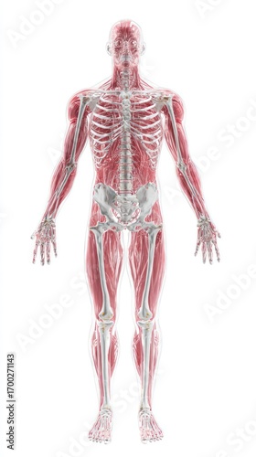 anatomy, body, three-dimensional, model, muscle, skeleton, bone, semi, transparent, structure, system, human, full, medicals, tissue, science, skin, layer, rib, spine, torso, pelvis, organ, detail, white, biology, physiology, diagram, clinical, health, study, leg, arm, chest, joint, figure, nerve, frame, head, map, illustration, concept, shape, visual, form, display, isolated