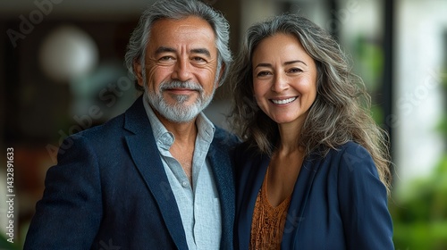 happy, hispanic, senior, male, female, business, executive, standing, side, by, office, formal, attire, tie, full body, joyful, success, life events, diversity, corporate, leadership, achievement, partnership, collaboration, management, career, progress, development, innovation, entrepreneurship, goal, vision, future, energy, motivation, power, influence, networking, communication, meeting, discussion, decision, making, environment, exterior