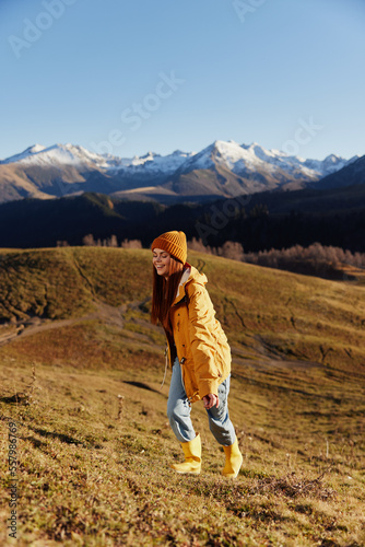 Full-length woman running up the hill to the camera and looking out at the mountains in a yellow raincoat and jeans in the autumn happy sunset camping trip, freedom lifestyle