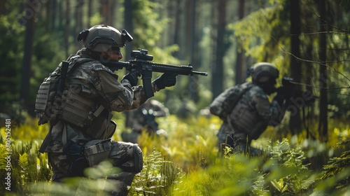 Fully Equipped Soldiers Moving Through Forest with Rifle Ready To Shoot. Reconnaissance Military Ope