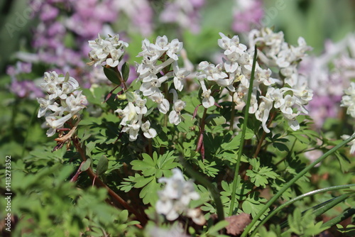 Fumewort (Corydalis solida) with white flowers. Flowering plant in spring garden