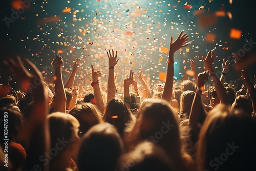 confetti, hand, woman, people, man, party, light, concert, event, fun, festival, crowd, nightclub, discotheque, entertainment, fan, leisure, arm, joy, nightlife, greeting, clubbing, disco, gesticulate, group, raising, show, unrecognizable, waving