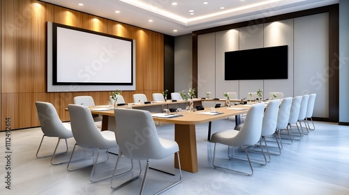 Functional and Stylish Conference Room with Integrated Tech and Clean Minimalist Decor