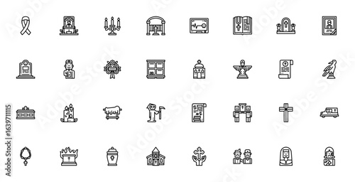 Funeral icon set. Minimal vector symbols pack. Includes cancer ribbon, altar, graveyard, coffin, cross, hearse, candles, deceased, prayer and more. Editable line art.