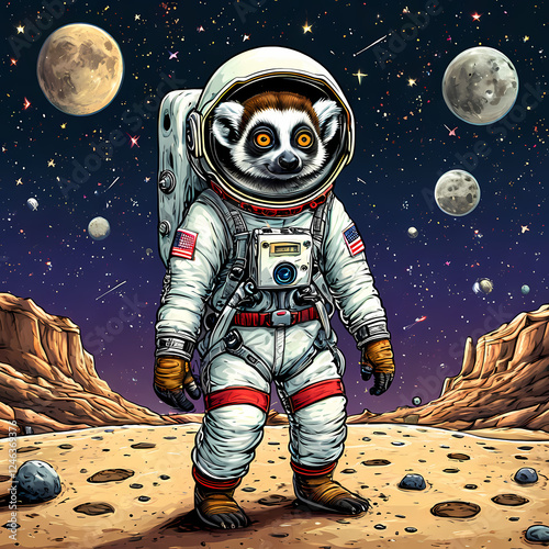raccoon, astronaut, space, illustration, character, humor, adventure, cosmic, planet, vibrant, playful, creative, astronomy, art, costume, exploration, science fiction, whimsical, colourful, joyful, enchanting, imaginative, cartoon, galaxy, portrait, fun, space suit, fantasy, discovery, friendly, extraterrestrial, scenery, unique, engaging, concept