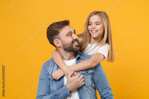 Funny bearded man in casual clothes have fun with child baby girl. Father little kid daughter isolated on yellow background. Love family day parenthood childhood concept. Hugging, look at each other.