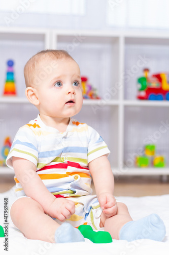 Funny cute caucasian baby boy playing with small green dumbbell. Sitting on white carpet in striped bodysuit. Different children's toys in the background.