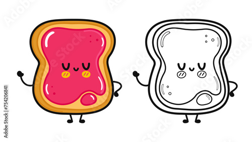 Funny cute happy Toast piece of bread with jam characters bundle set. Vector hand drawn cartoon kawaii illustration. Cute Toast piece of bread with jam. Outline cartoon illustration for coloring book