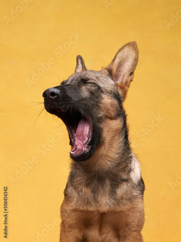 funny dog yawns on on a yellow background. Playful wolfdog puppy.