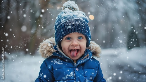 Funny excited little boy in blue winter clothes walks during a snowfall. Outdoors winter activities for kids. Cute child wearing a warm hat catching snowflakes with his tongue