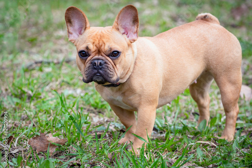 Funny French bulldog playing on a green meadow