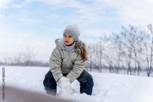 Funny girl throws snow up to the sky and rejoices. Happy children play snowballs, run, throw snow. Funny kids play games indoors in the winter with snow