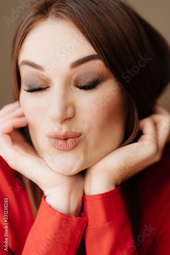 funny, girl, long, hair, red, dress, making, face, kiss, close, eye, beautiful, dark, background, studio, beauty, caucasian, fashion, female, model, portrait, posing, black, brunette, cute, face, coiffure, style, white, attractive, elegant, glamour, sensuality, woman, young, brown, smile, elegance, lady, luxury, make-up, sensual, stylish, heel