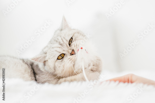 Funny gray cat playing with a toy.Beautiful light pussy