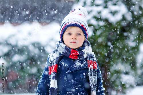 Funny little kid boy in colorful clothes playing outdoors during strong snowfall