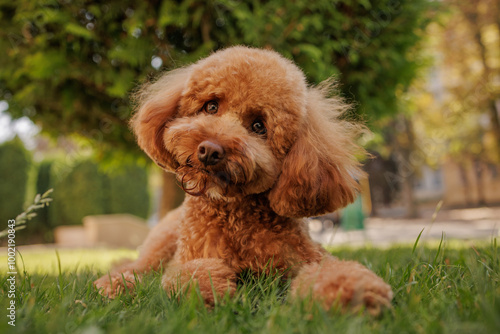 funny maltipoo dog lying on grass in park, brown dog portrait, love for dogs