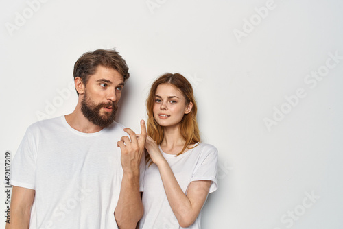 funny man and woman in white t-shirts are standing side by side friendship communication