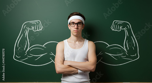 man, fitness, funny, nerd, muscle, humor, geek, portrait, athletic, dumbbell, blackboard, absurd, strength, gym, white, dumb, sport, slender, drawing, bodybuilding, power, weightlift, student, goggles, physical, training, weak, young, male, thin, person, humorous, confident, humor, performance, weight, concept, muscle, pose, studio, success, chalk, exercise, slimmer, posing, cheerful