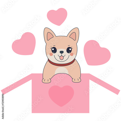 Funny orange welsh corgi in box and hearts vector illustration. Cool dog welsh corgi. Cartoon dog