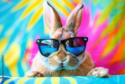 Funny rabbit or bunny with sunglasses in a brightly colored studio setting.