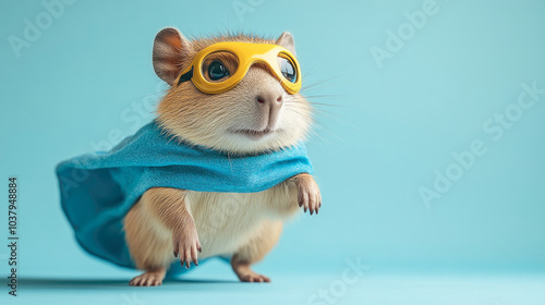 Funny scene of сute capybara in superhero costume jumping and flying on light blue background with copy space.