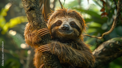 Funny sloth hanging on tree branch.