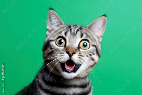 Funny surprised cat isolated on bright green background. Studio portrait of a cat with amazed face.