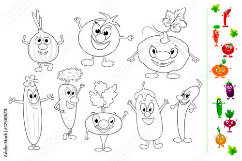 Funny vegetables coloring book. Set of various funny cartoon vegetables for coloring. Creative leisure for young children