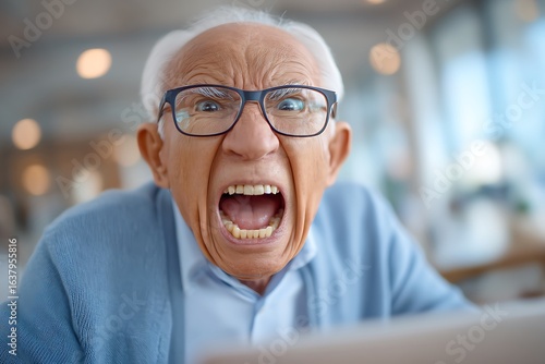 senior, man, elderly, angry, rage, frustrated, shouting, yelling, screaming, mad, irate, annoyed, face, expression, emotion, negative, stress, anxiety, problem, old, mature, eyeglass, goggles, closeup, portrait, indoor, upset, caucasian, white, open mouth, teeth, wrinkled, crabby, closeup, closeup, one person, finance, learning, nature, fitness, family