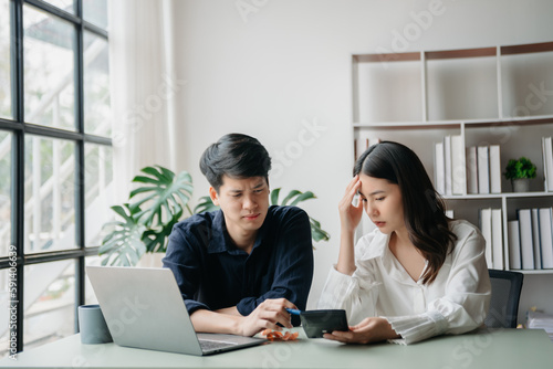 ..Furious two Asian businesspeople arguing strongly after making a mistake at work in office