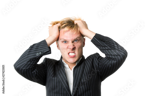 agitated, anger, angry, anxiety, bad, bizarre, black, block, blond, caucasian, closeup, displeased, evil, expression, face, facial, fear, grimace, guy, irritated, irritation, isolated, madness, man, mean, mood, 1, people, person, portrait, scarey, shirt, stress, tearing, white, young