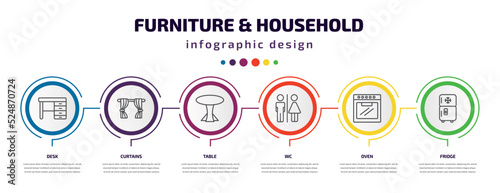 furniture & household infographic template with icons and 6 step or option. furniture & household icons such as desk, curtains, table, wc, oven, fridge vector. can be used for banner, info graph,
