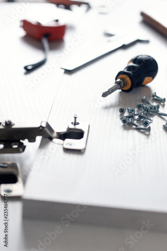 construction industry, equipment, work tool, repairing, industry, screwdriver, closeup, metal, wood, technology, single object, installing, home improvement, carpenter's shop, turning, part of, assembly, furniture, tool, screw, hinge, curtain, white, measure, tape measure, vernier caliper