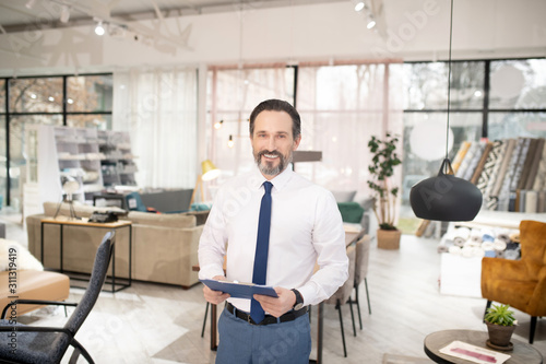 man, mature adult, 45, bearded man, caucasian, handsome man, one person, alone, indoor, interior, businessman, at work, adviser, manager, attaching, white shirt, elegant, light, good-looking, photogenic, modern, contemporary, light, standing, good mood, office worker, black shoes, contented, smiling