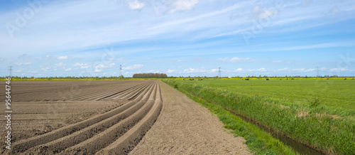 grooved, plowed, agriculture, flower, spring, blowball, wildflower, foliage, countryside, rural, yellow, green, blue, tree, season, nature, outdoors, field, sunlight, sky, sunny, perspective, landscape, scenic, tranquil, holland