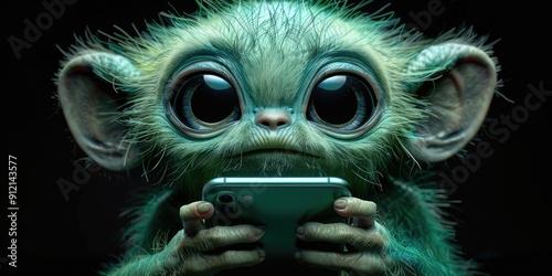 furry, creature, smartphone, cute, whimsical, oversize, dark background, curious, fantasy, digital artwork, modern, playful, charming, technology, contraption, cartoon, surreal, amusing, pet, cyberspace, mysterious, fluffy, adorable, big eye, expressive, friendly, imaginative, comical, fuzzy, contemporary, enchanting, endearing, captivating, blithe, funny, unique