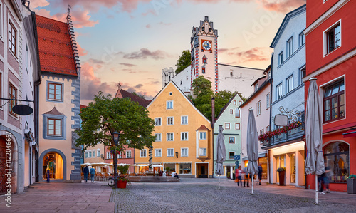 Fussen, Bavaria, Germany. Streets of the central square old town near Neuschwanstein and Hohenschwangau famous castles. View at castle with tower during sunset. Popular travel destination