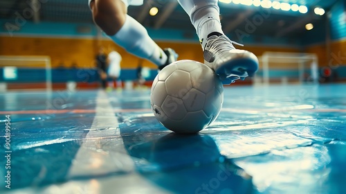 futsal, player, foot, ball, indoor, court, sport, game, competition, athletic, soccer, football, leg, team, sportsman, active, professional, action, dynamic, movement, sharpened, energy, technique, skill, control, passion, floor, line, white, blue, yellow, blurry, background, sporting, goal, net