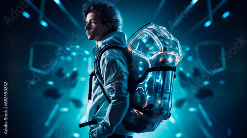 Future military and civilian technology and transportation with jet pack. A man is ready to fly with drone engine. Express fast speed flying. Innovation invention concept.