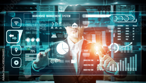 Future virtual reality technology for innovative VR warehouse management . Concept of smart technology for industrial revolution and automated logistic control .
