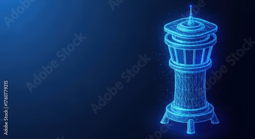 technology, aviation, digital, network, futuristic, tower, control, aerodrome, traffic, air, flight, navigation, wireframe, hologram, blueprint, virtual, cyber, blue, glowing, datum, information, communication, system, structure, three-dimensional, model, render, graphic, concept, innovation, modern, connection, mesh, polygon, aglow, particle, dot, line, abstract, infrastructure, surveillance, security, management, logistic, transportation, radar, building, architecture, illustration