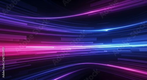 Futuristic abstract background with glowing neon light streaks in blue, purple, and pink. Dynamic forward motion effect, vibrant contrast, smooth gradient, and immersive depth.