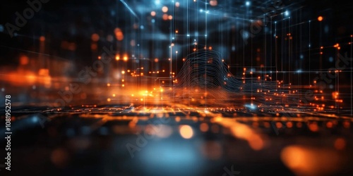 Futuristic Abstract Digital Landscape with Glowing Particles, Light Beams, and 3D Grid Technology in a Striking Network Environment