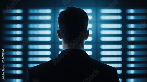Futuristic AI Technology with Backlit Figure in Business Attire Facing a Digital Environment