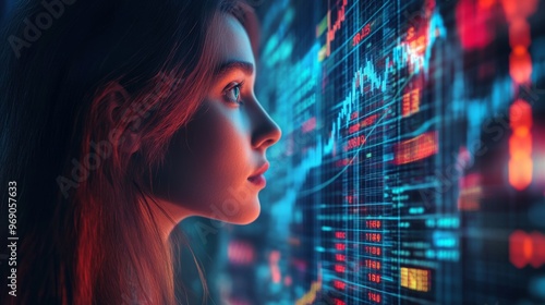 Futuristic AI-powered virtual personal finance advisors predicting market trends: AI systems offering personalized financial advice and stock market predictions.
