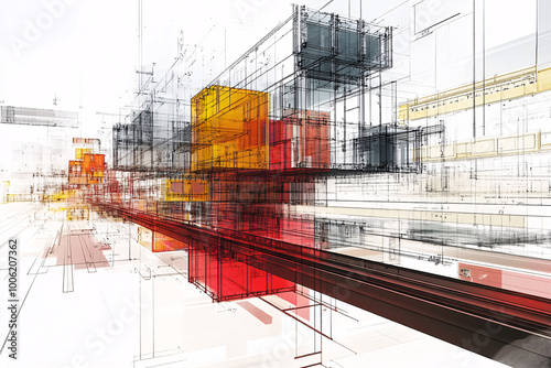 futuristic, architectural, vignetting, colourful, transparent, block, abstract, line, modern, design, concept, architecture, innovation, geometry, perspective, construction, industrial, material, structure, layer, overlapping, minimalist, technical drawing, wireframe, clean, planning, building, red, yellow, orange, industrial design, complex, steel, engineering, urban