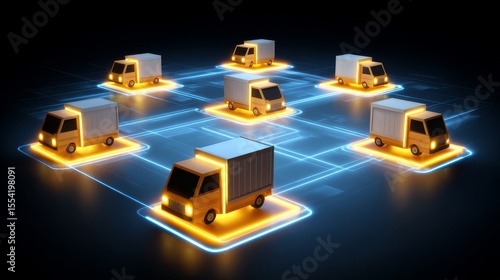 Futuristic arrangement of seven delivery-style trucks on glowing square platforms with bright yellow-orange borders, connected by blue neon grid lines, illuminated headlights, dark background,