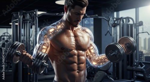 athlete, cybernetic, technology, fitness, gym, weight, muscular, physical exercise, training, future, bodybuilding, digital, augmentation, strong, exercise, health, modern, perspiring, determination, intensity, strength, circuitry, artificial, intelligence, robotic, enhancement, innovation, progress, power, machine, human, performance, muscle, dedication, sharpened, energy, motivation, discipline, robot