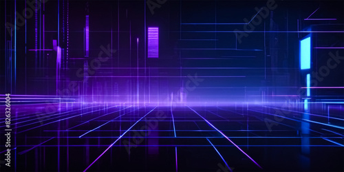Futuristic background and digital grid pattern with neon blue and purple on a dark background